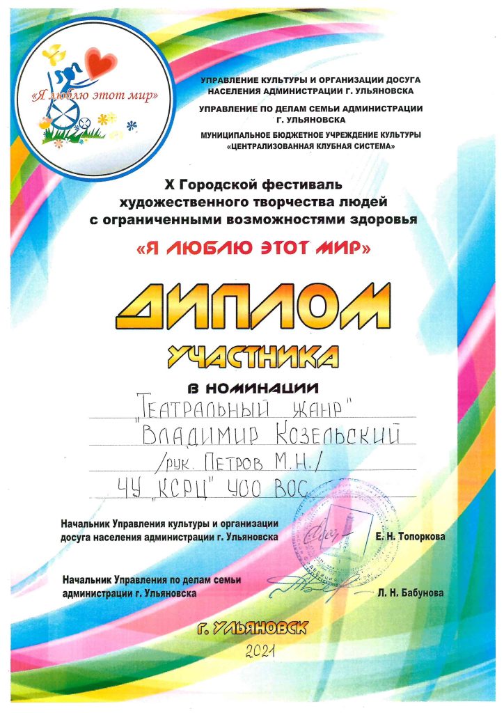 Дипломом за участие награждён Владимир Козельский в номинации «Театральный жанр»…