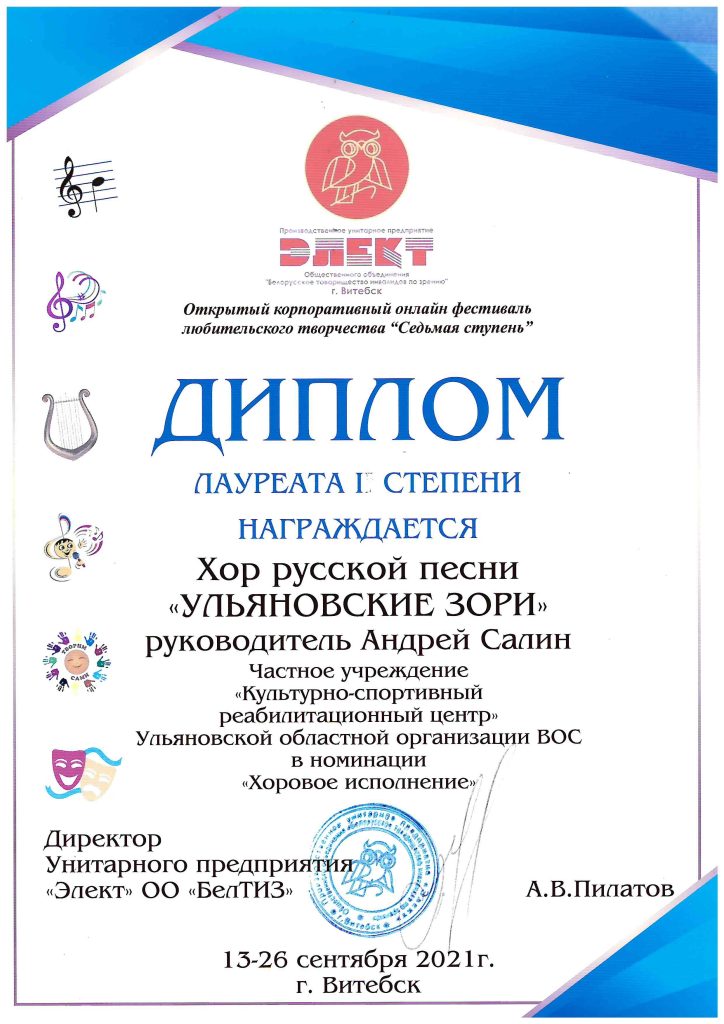 Награждён вокальный коллектив «Симбирцит» (руководитель — В.Н.Сячин)