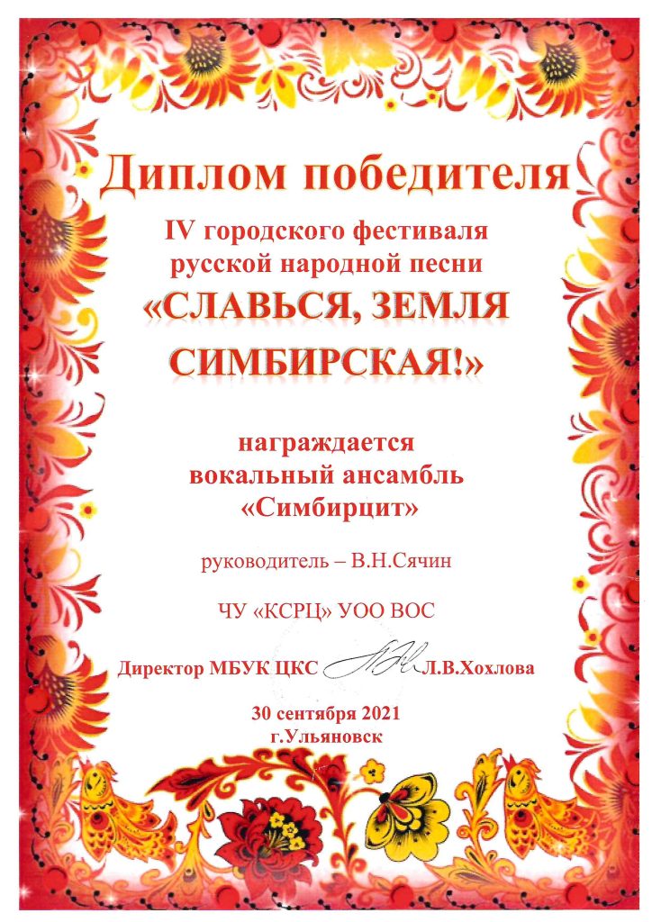Награждён вокальный ансамбль «Симбирцит» ( руководитель В.Н. Сячин)