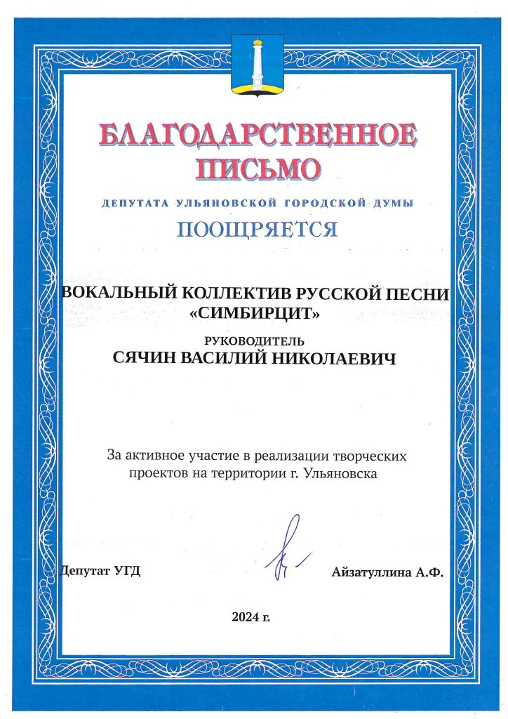 Награждён народный коллектив вокальный ансамбль «Симбирцит» (руководитель В.Н. Сячин)