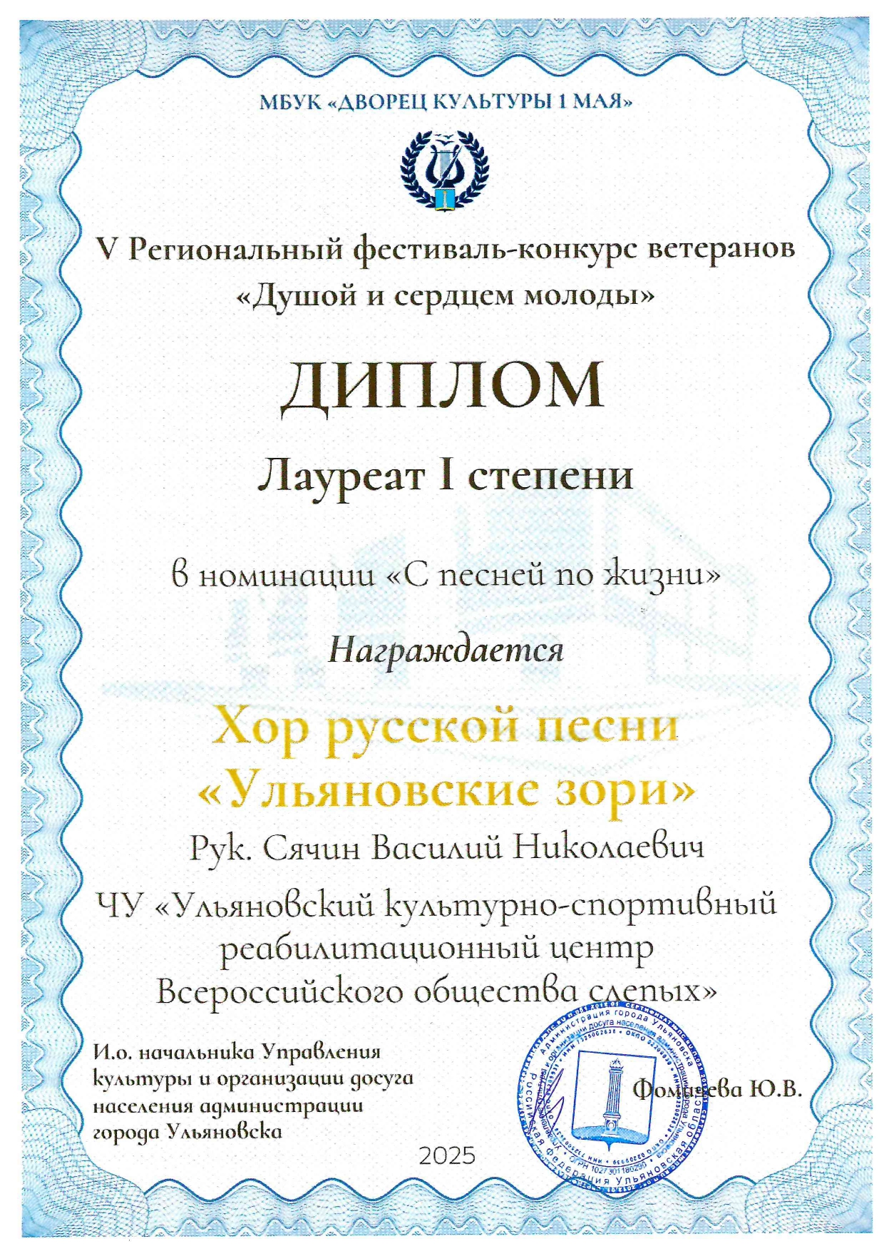 Награждён хор русской песни "Ульяновские зори" в номинации "С песней по жизни" V Регионального фестиваля-конкурса ветеранов "Душой и сердцем молоды"