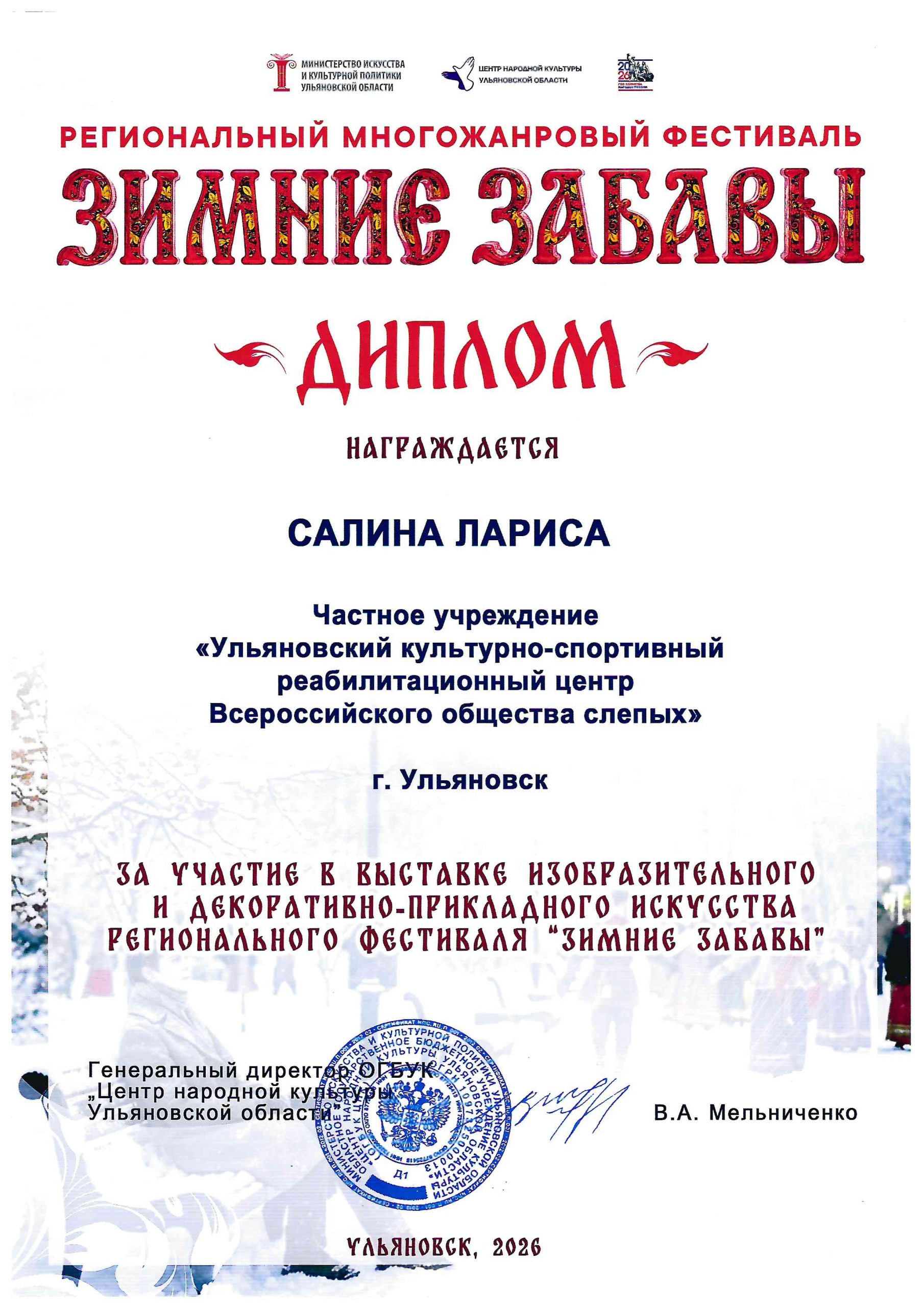 Дипломом за участие в выставке изобразительного и декоративно-прикладного искусства Регионального фестиваля «Зимние забавы» награждена участница кружка «Живая ниточка»Салина Лариса