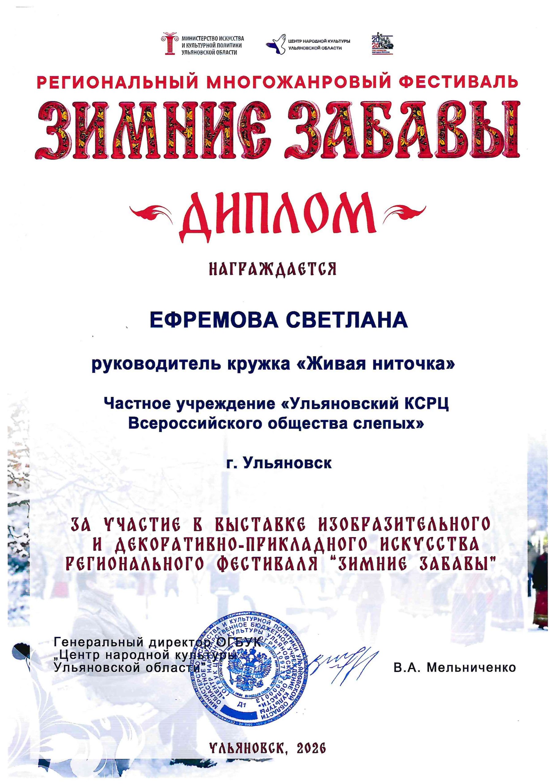 Дипломом за участие в выставке изобразительного и декоративно-прикладного искусства Регионального многожанрового конкурса «Зимние забавы» награждена руководитель кружка «Живая ниточка» Светлана Ефремова