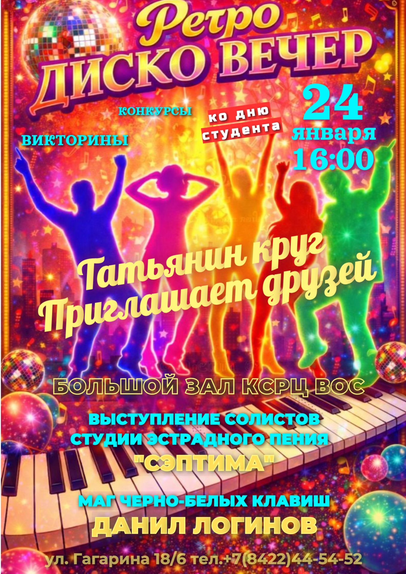 Дорогие друзья! МЫ приглашаем Вас на ретро-диско-вечер "Татьянин круг - приглашает друзей!", посвящённый Российскому Дню студента.