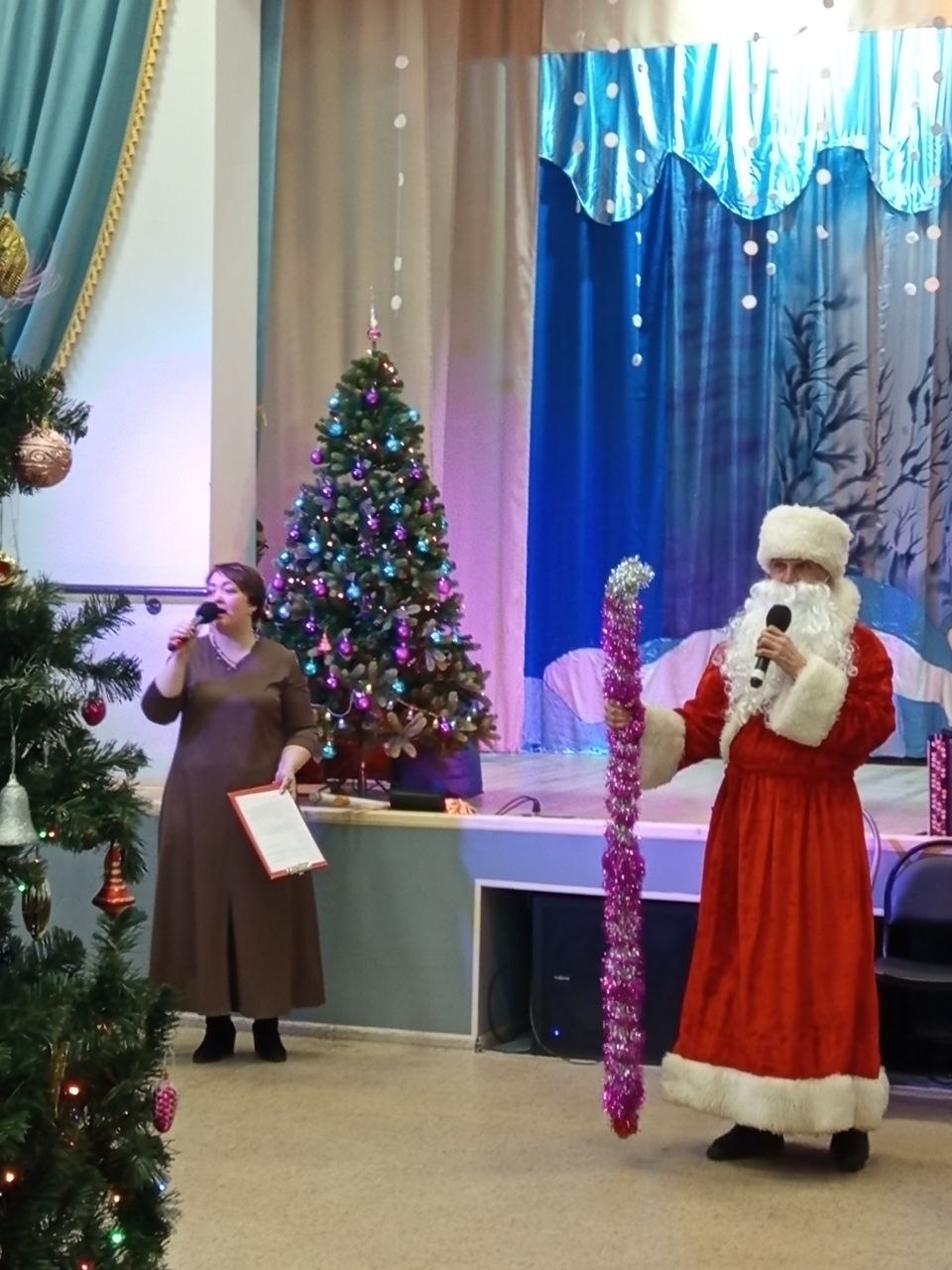 Праздничная программа была наполнена стихами и шутками, викторинами и конкурсами., хороводами возле ёлки и зажигательной дискотекой.И конечно же, все ждали прихода новогоднего гостя - дедушки Мороза, который в качестве подарка принёс с собой баян.